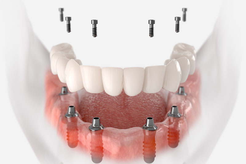 A full, fixed set of teeth offers a permanent solution using the latest dental technology to give you a beautiful smile that’s as good as or even better than the one nature gave you. This option is chip and stain-resistant, doesn’t need to be removed, and is custom-designed to fit securely onto 4-6 implants per arch.